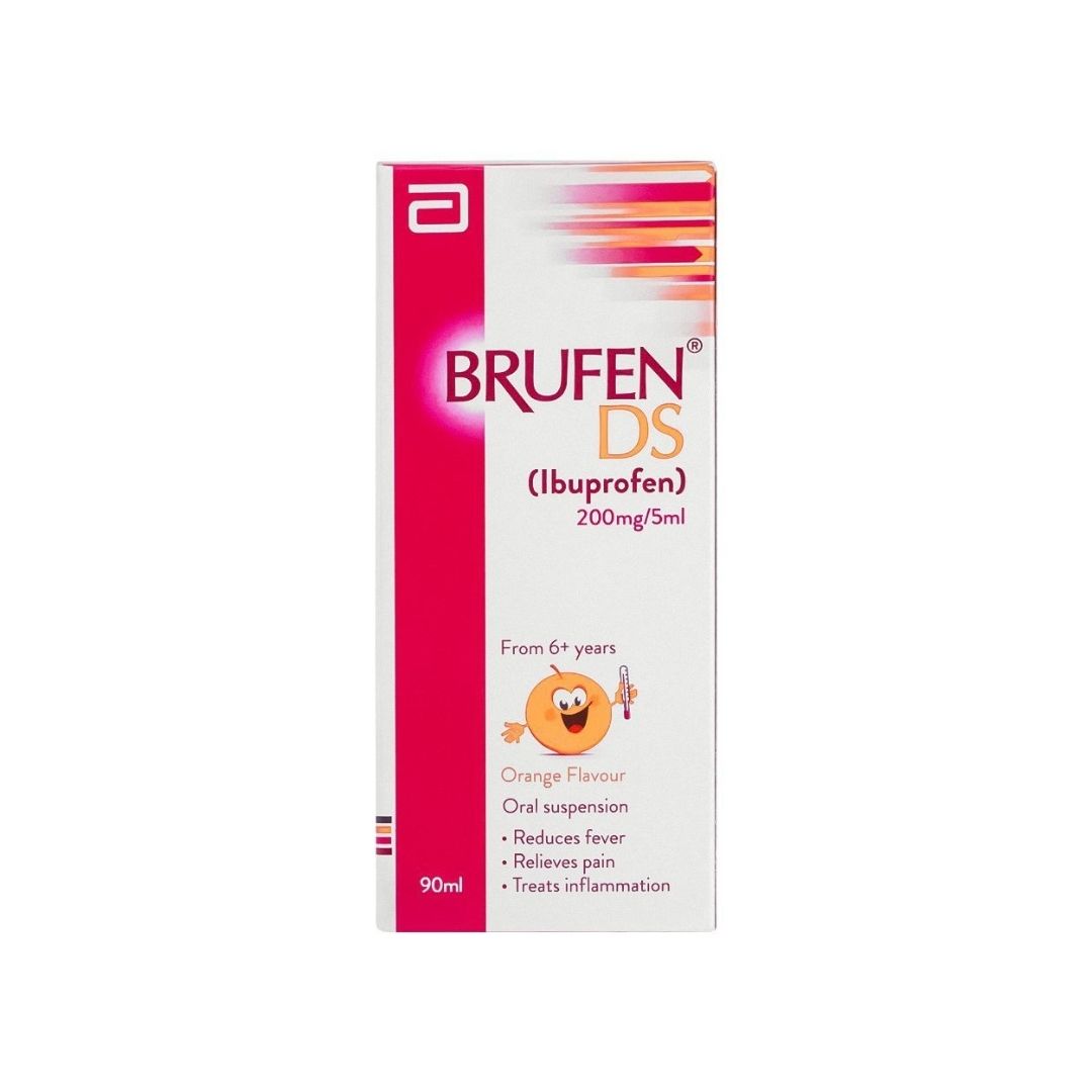 Abbott Brufen DS Suspension 90ml is a childrenβs oral suspension containing 200mg/5ml ibuprofen. It provides fast relief from fever, pain, and inflammation with a pleasant orange flavour, suitable for kids aged six and above.
