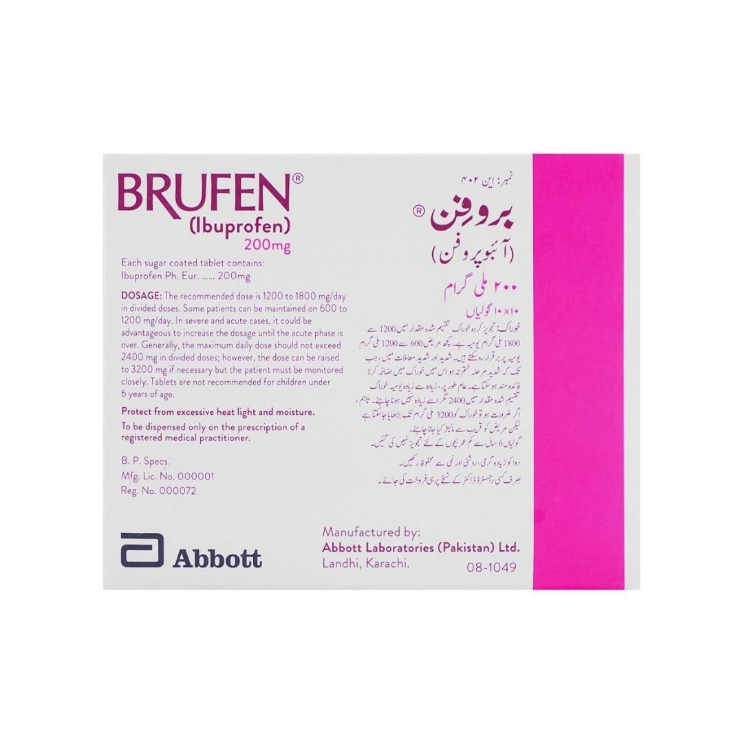 Abbott Brufen Tablet 200mg 1-Strip is a trusted pain reliever containing ibuprofen. It helps reduce fever, inflammation, and various types of body pain, offering fast and effective relief.