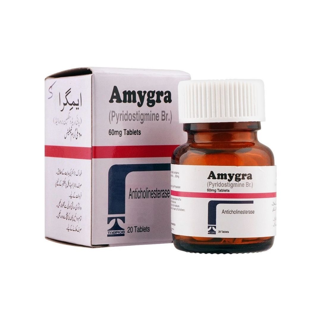 Amygra 60mg 20 tablets contain Pyridostigmine Bromide, an anticholinesterase that enhances nerve-muscle communication to improve strength in myasthenia gravis patients.