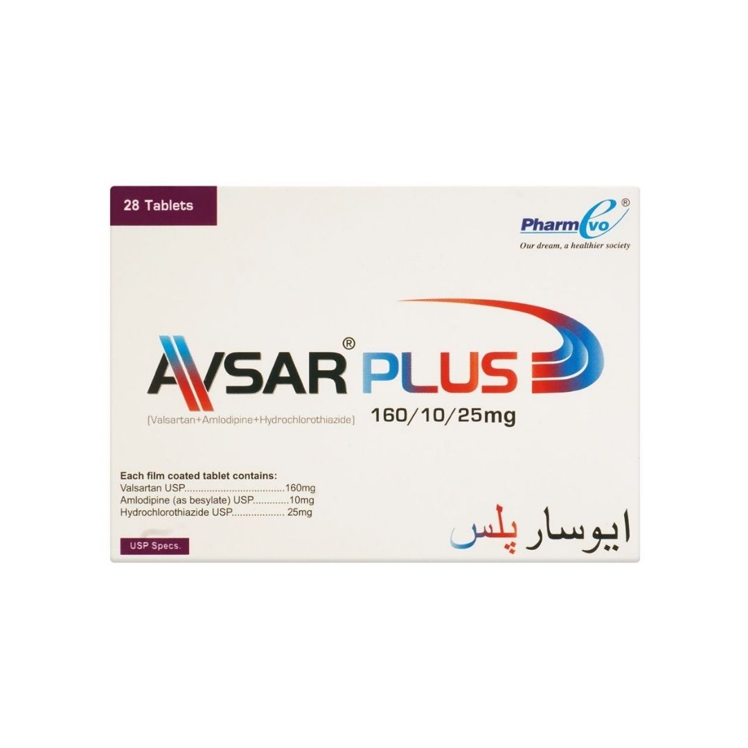 Avsar Plus 160/10/25mg 28 tablets offer a triple-action formula with Valsartan, Amlodipine, and Hydrochlorothiazide to manage hypertension and reduce cardiovascular risks.