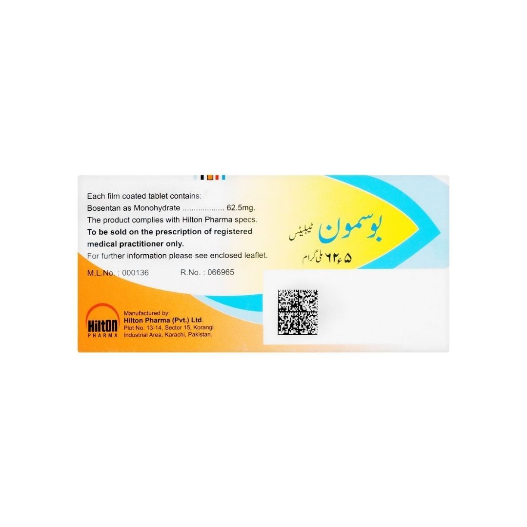 Hilton Pharma Bosmon Tablets 62.5mg (Bosentan Monohydrate) are prescribed for managing pulmonary arterial hypertension (PAH). They work by relaxing blood vessels, reducing blood pressure in the lungs, and improving the ability to exercise and breathe more comfortably. For use under medical supervision only.