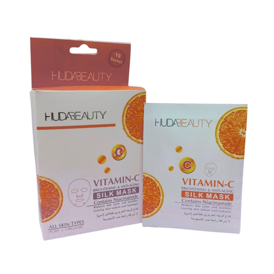 Huda Beauty Vitamin-C Silk Mask with Niacinamide brightens, hydrates, and reduces fine lines. Pack of 10, suitable for all skin types.
