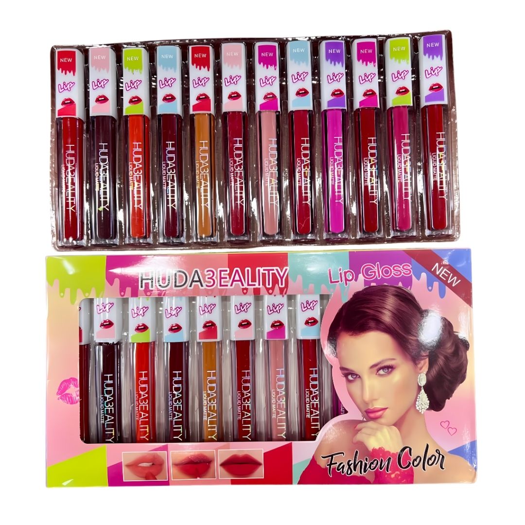 Shiny and vibrant Huda3eality lip gloss set with multiple long lasting shades.