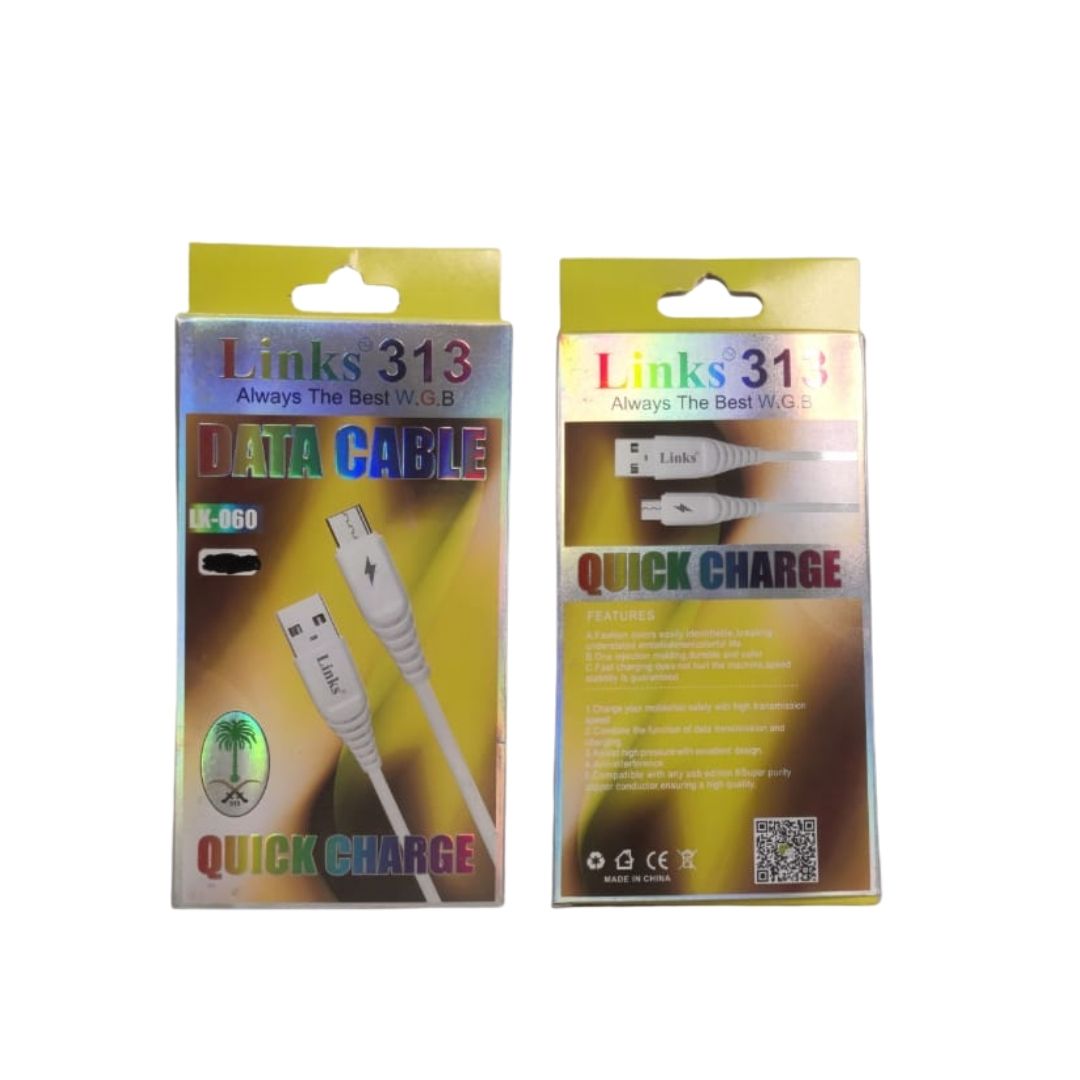 The Links 313 Quick Charge Data Cable (LK-060) delivers high-speed charging and smooth data transfer. Built with durable materials for long-lasting use, it’s compatible with most smartphones and tablets.